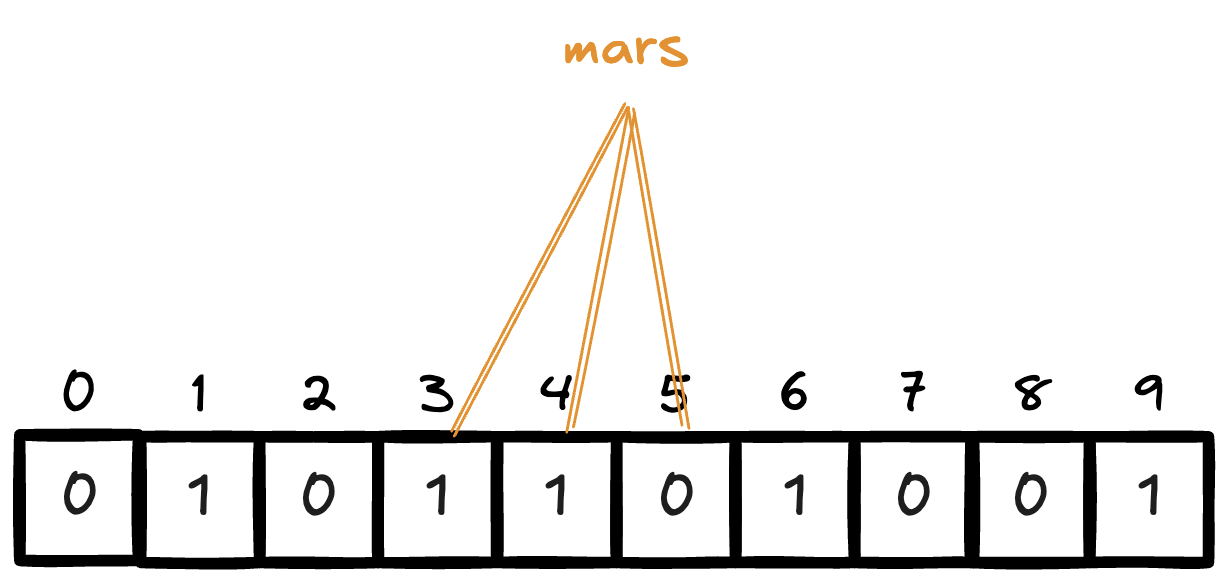 어떤 문자(mars)가 이 집합에 속하는 지를 확인할 때 이렇게 만들어진 bit array를 사용한다. 마찬가지로 k개의 hash function을 수행한 후 modulo연산을 진행해서 해당 문자의 bit의 값들이 모두 1이면, 해당 문자는 이 집합에 속한다고 판단한다. 이 과정에서 hash collision이 발생하면 집합에 없는 문자인데도, 집합에 있다고 판단할 수 있는 문제가 발생하기도 한다.