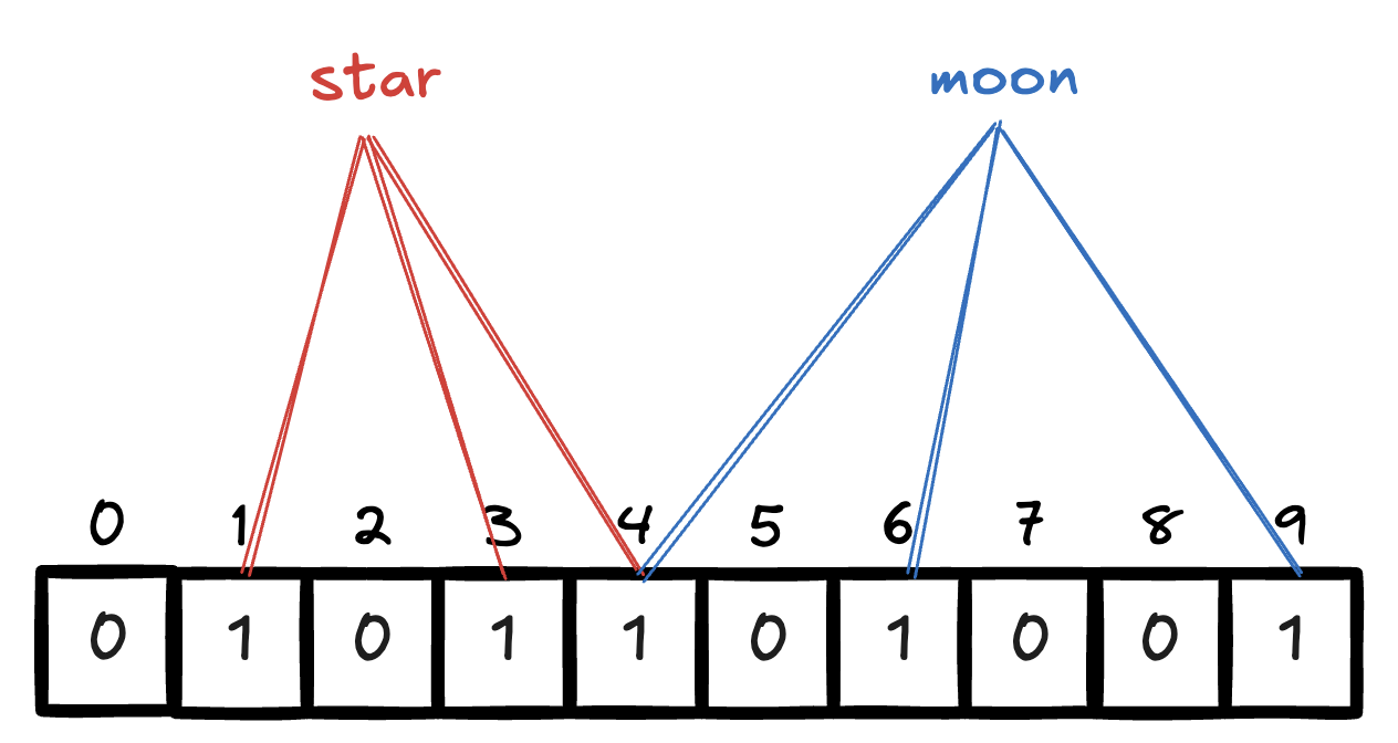 Bloom Filter는 0으로 셋팅되어 있는 bit array를 사용한다. 그리고, 두 개의 멤버(star, moon)를 이 Bloom Filter에 넣는다면 k개의 hash function을 사용한 후 modulo 연산을 해서 bit를 1로 채워넣는다.